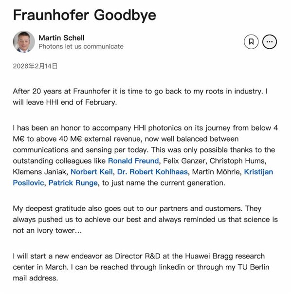 马丁・谢尔上个月在LinkedIn上宣布,已辞去HHI主任职务,并结束了在柏林工业大学光学与光电子整合讲席教授的任期,从3月起正式加入华为。